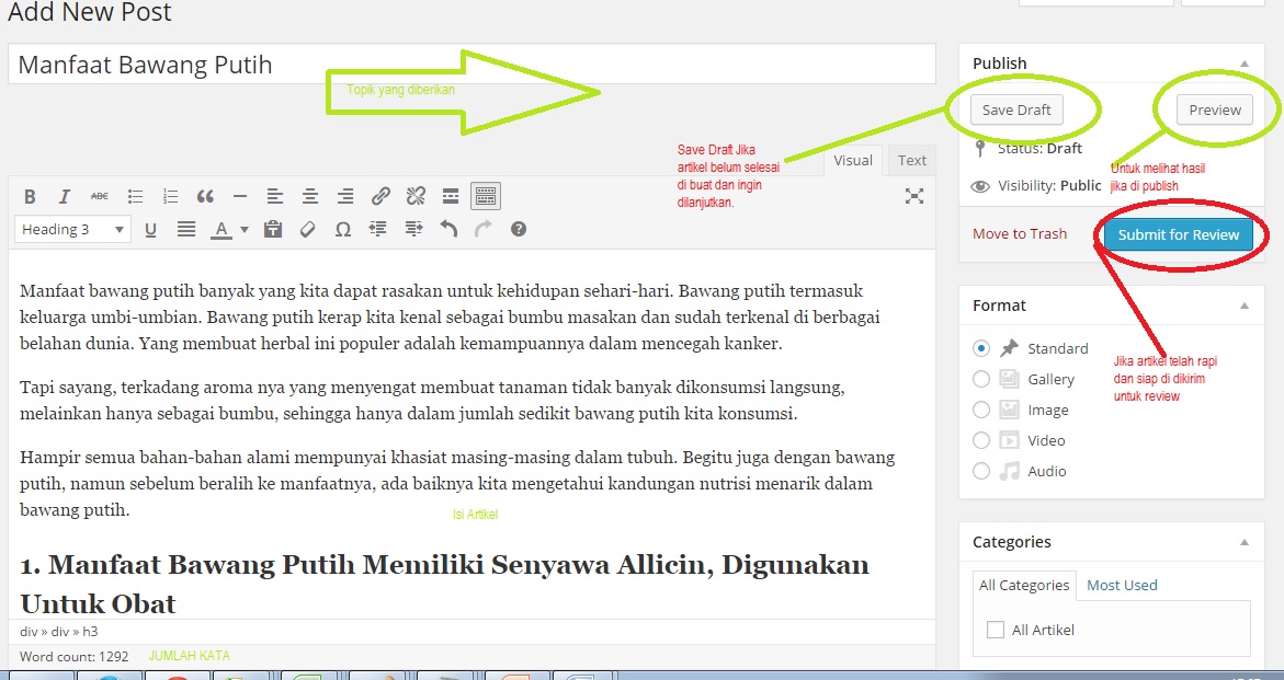 - Save Draft : Simpat dulu jika artikel belum selesai dibuat
