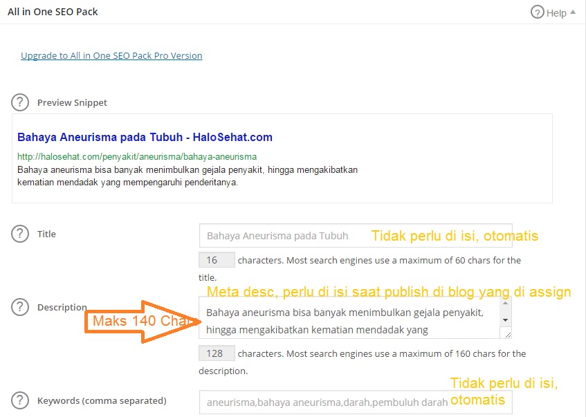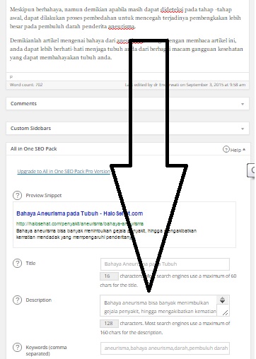- Dibagian bawah dashboard artikel ada bagian “All in one seo pack”
